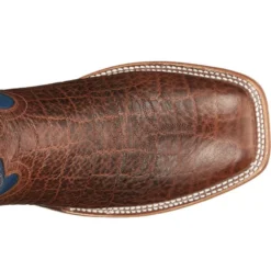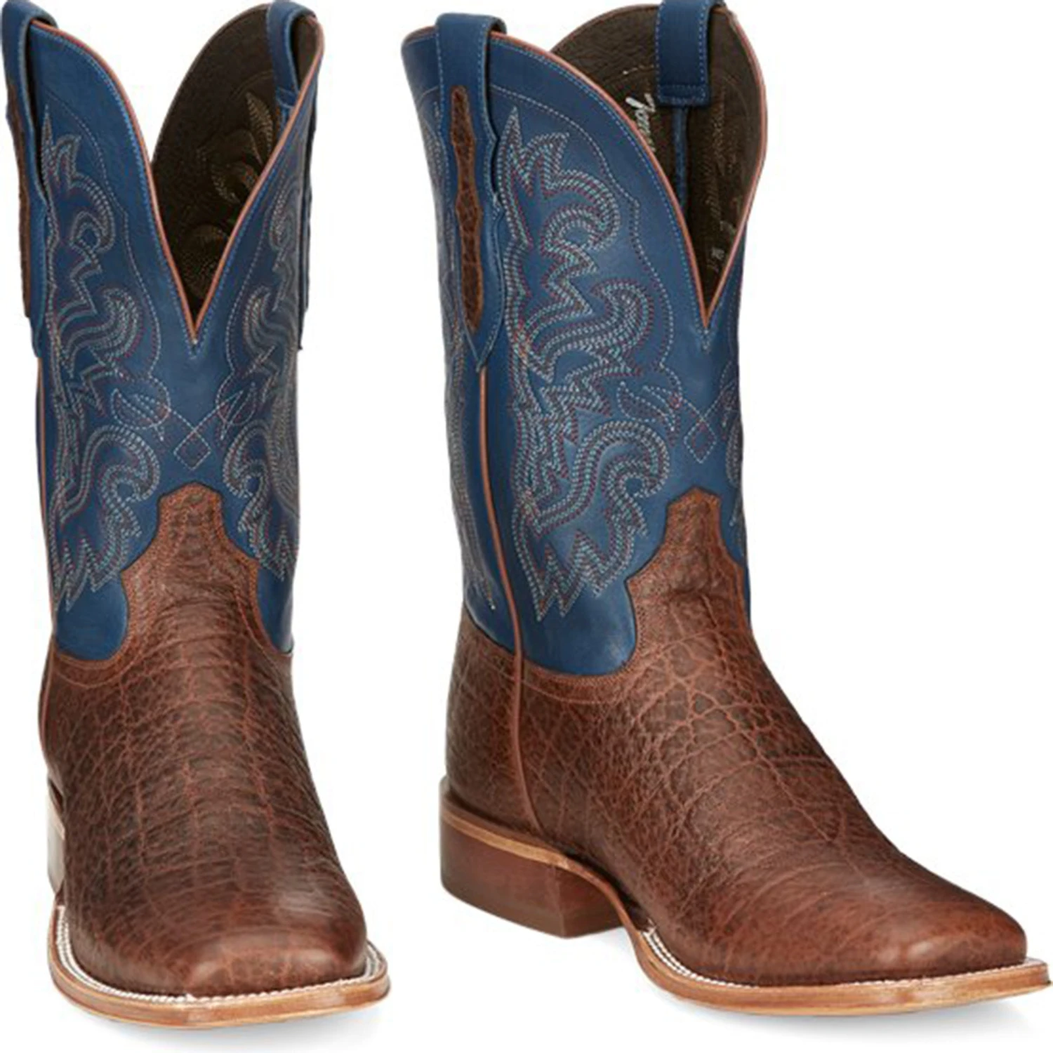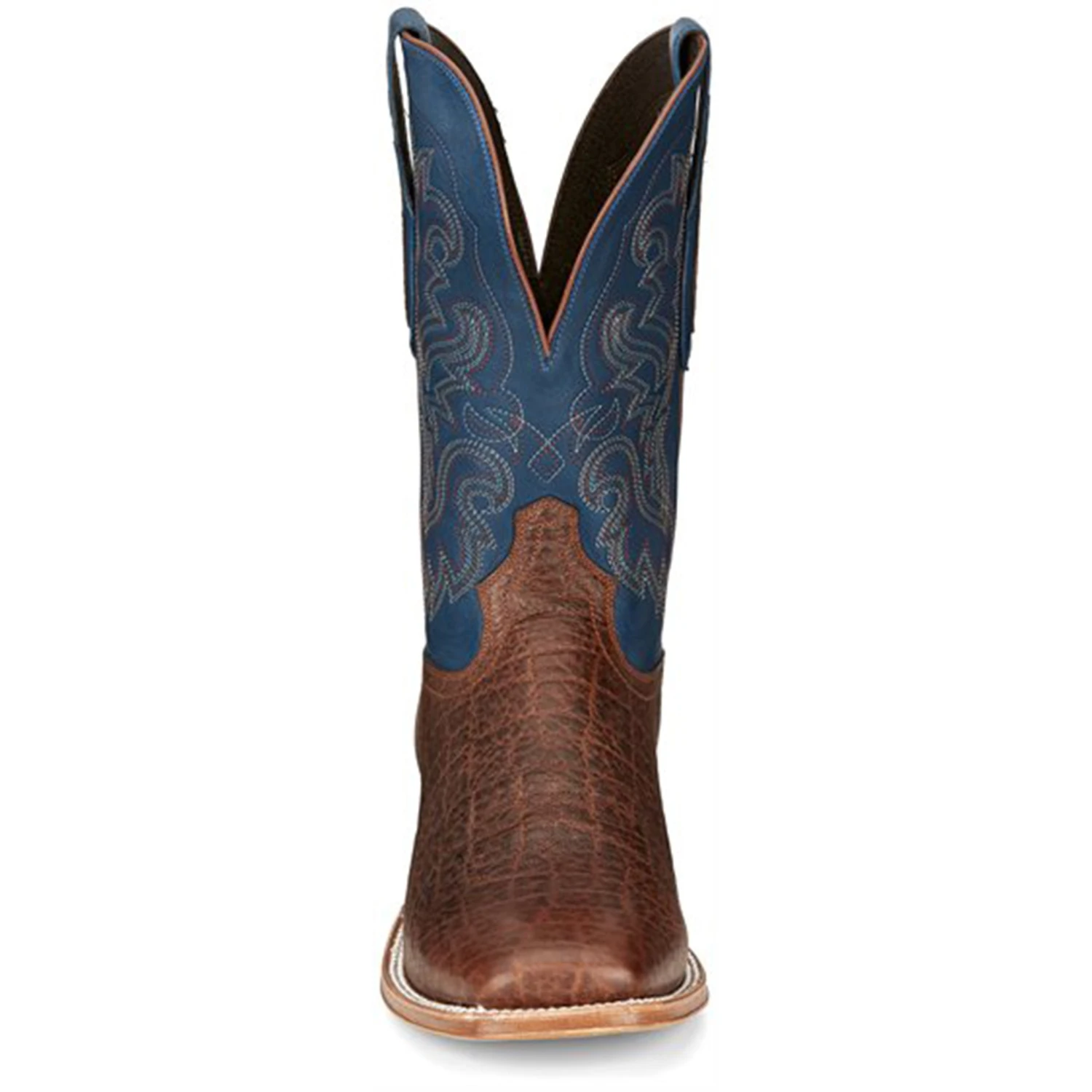 Stand out with these striking boots expertly crafted from the finest materials. A bold take on iconic western style from the 1911 collection, the Jinglebob boot in Cognac Safari features vivid blue cowhide leather atop a classic cognac safari brown cowhide vamp. This 11” silhouette stands on a 1 1/8” walking heel with spur ledge for a timeless look.